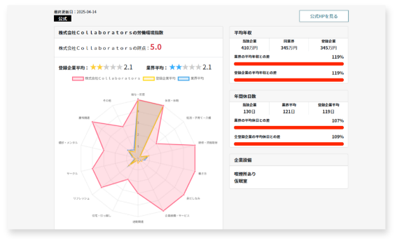 弊社独自に調査した企業データの「平均」と比較。給与や休日の平均と比較できます。本来、職種や地域によって偏りがあります。大きな差がないか確認いただけます。