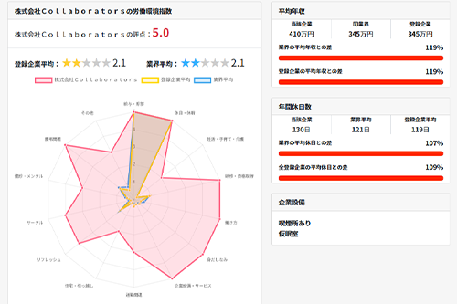 弊社独自に調査した企業データの「平均」と比較。給与や休日の平均と比較できます。本来、職種や地域によって偏りがあります。大きな差がないか確認いただけます。