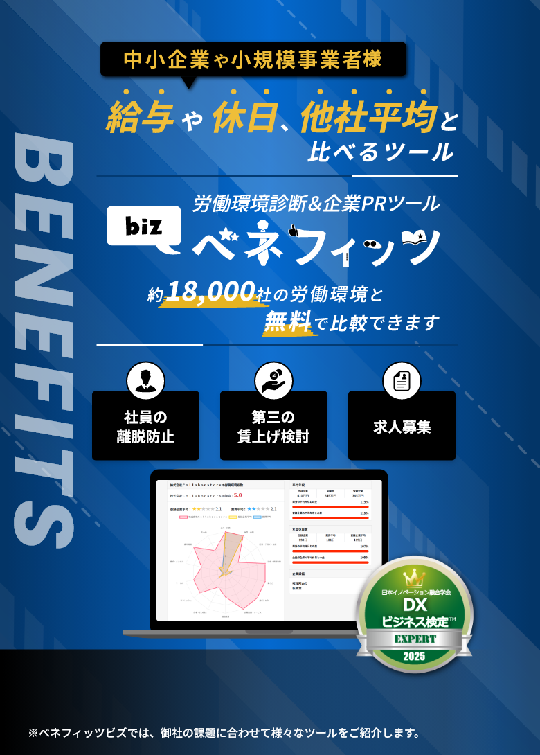 ベネフィッツビズは、御社の労働環境を“見える化”できる診断ツールです。一般的な就業規則を整備している企業であれば、平均して★4以上の高評価が得られる傾向があります。